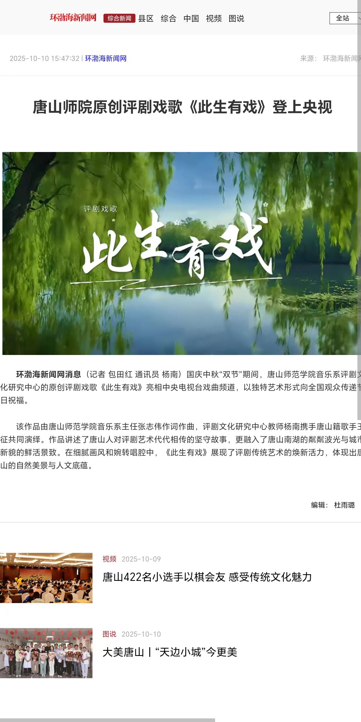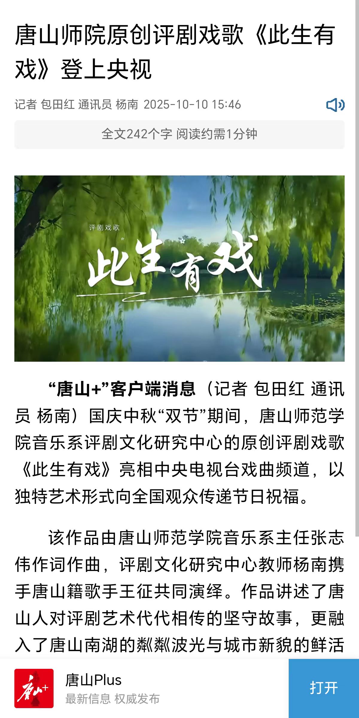 国庆中秋“双节”期间,伟德国际victor1946官网音乐系评剧文化研究中心的原创评剧戏歌《此生有戏》亮相中央电视台戏曲频道,以独特艺术形式向全国观众传递节日祝福。