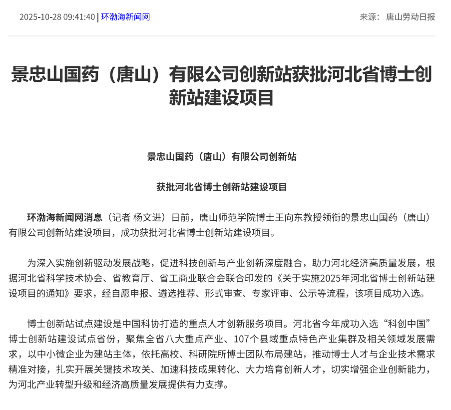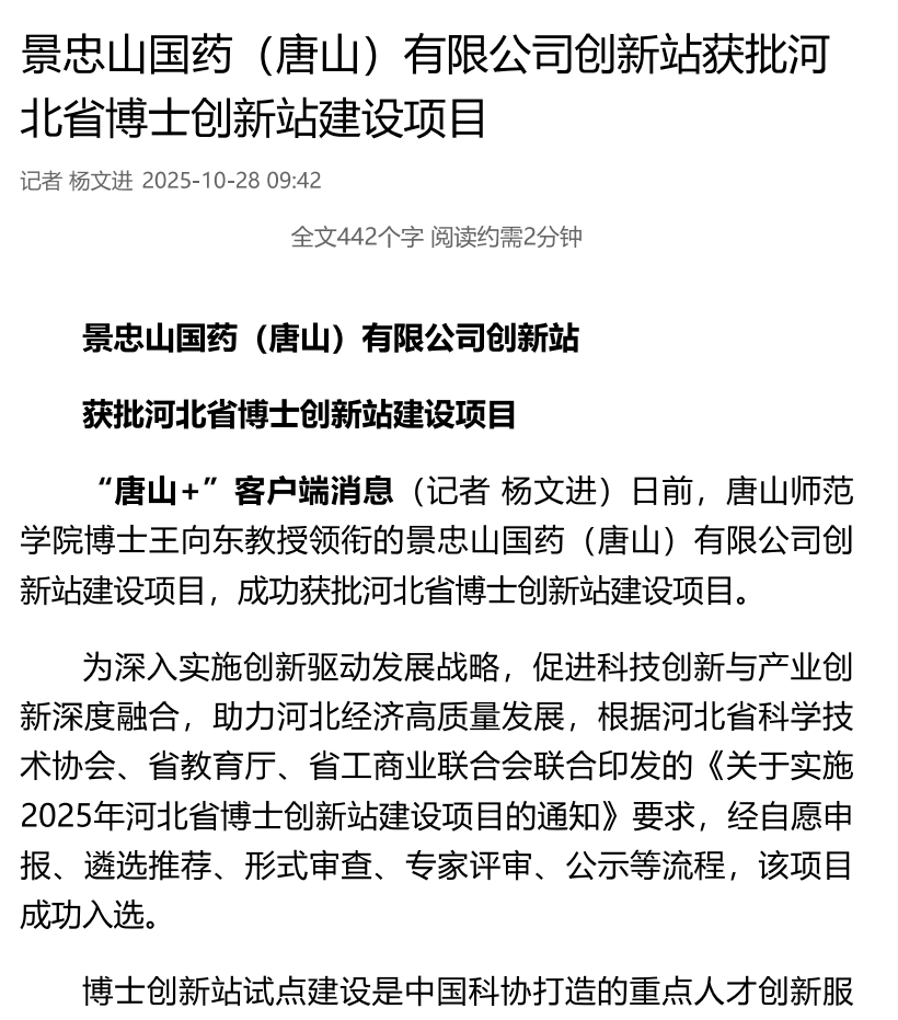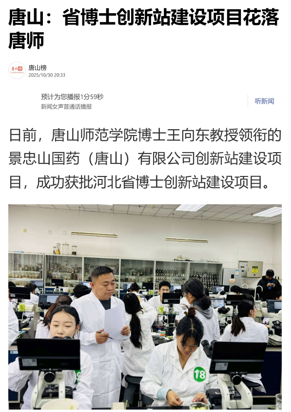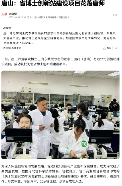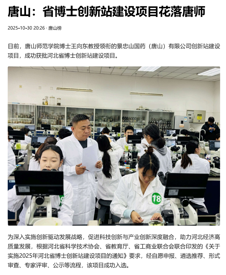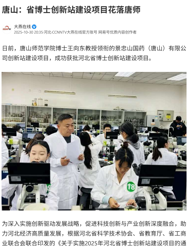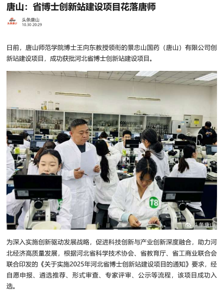 伟德国际victor1946官网博士王向东教授领衔的景忠山国药(唐山)有限公司创新站建设项目,成功获批河北省博士创新站建设项目。