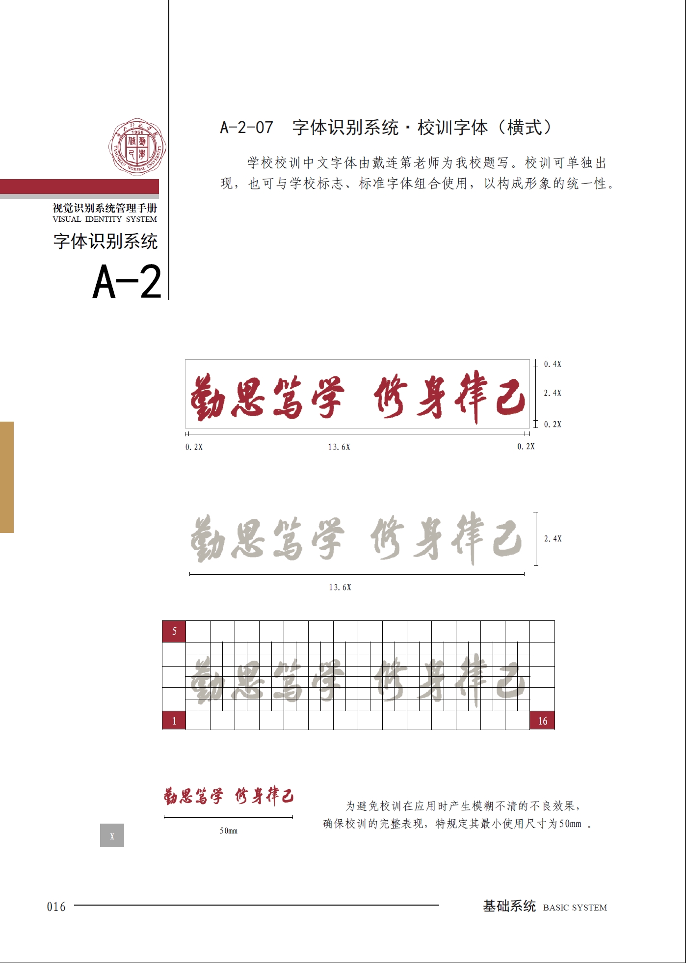 学校建立视觉形象标识系统,规范使用校名、校徽等学校标识。学校的校徽:正中是“勤学修己”四个篆书,正上方边框内是数字“1956”,圆形边框内是中英文校名。